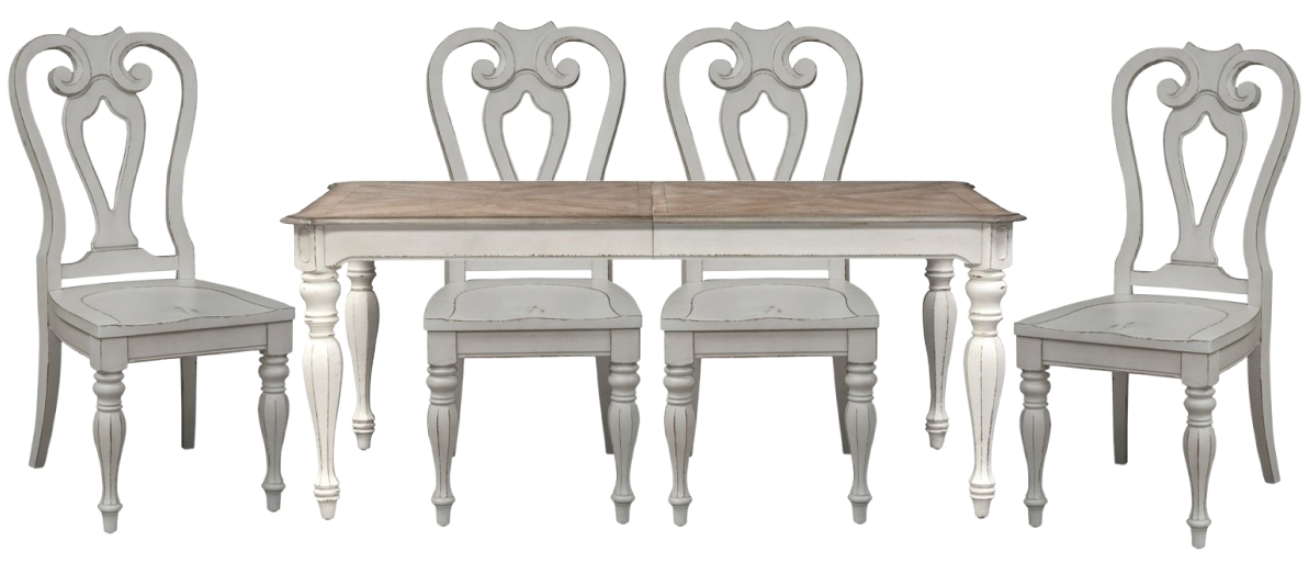 Create a grand gathering with the Magnolia Manor optional five-piece leg table set, consisting of four splat back side chairs and a rectangular leg table. Crafted of poplar solids with cathedral white oak veneer, this kit features an antique white finish with heavy chipping and a weathered brown top with whitewash.Read More