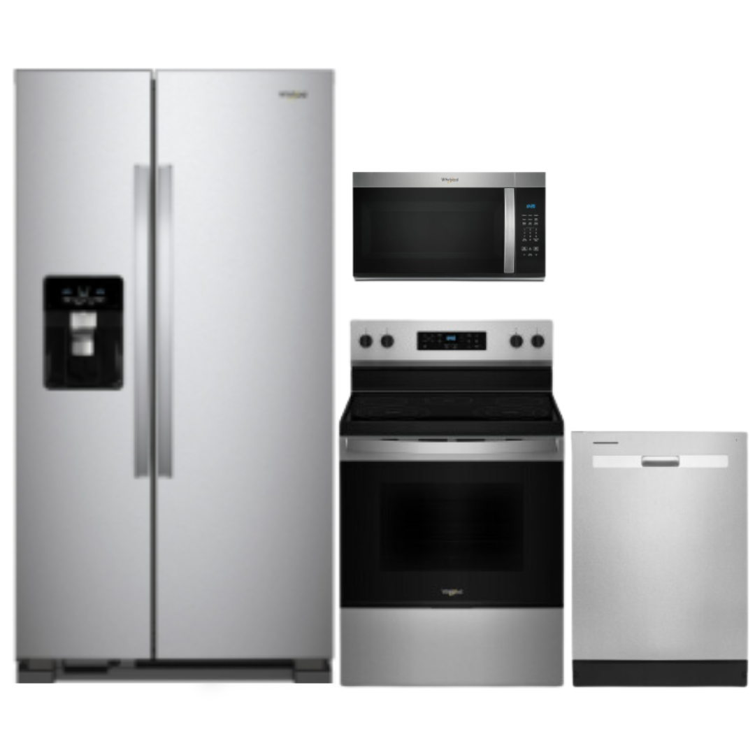 Whirlpool® 4 Piece Fingerprint Resistant Stainless Steel Kitchen Package with french door refrigerator, free standing electric range, over the range microwave, and built in dishwasherRead More
